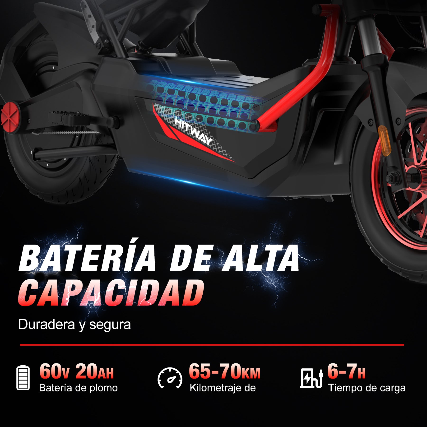 1000 W super motor, potencia máxima de hasta 1500 W, arranque rápido, acelera ferozmente, el ángulo máximo de subida de 15 °, 51 km/h experiencia de velocidad que se dispara la eficiencia de los desplazamientos. 60 V 20 AH batería de gran capacidad trae increíble 65-70 km de largo alcance, y 6-7 horas de carga rápida no se retrasa en absoluto. Ya se trate de potencia, velocidad o alcance, este moto tiene un equilibrio perfecto entre rendimiento y practicidad, y cada vez que gire el acelerador, se puede sentir la potencia de sobretensión.