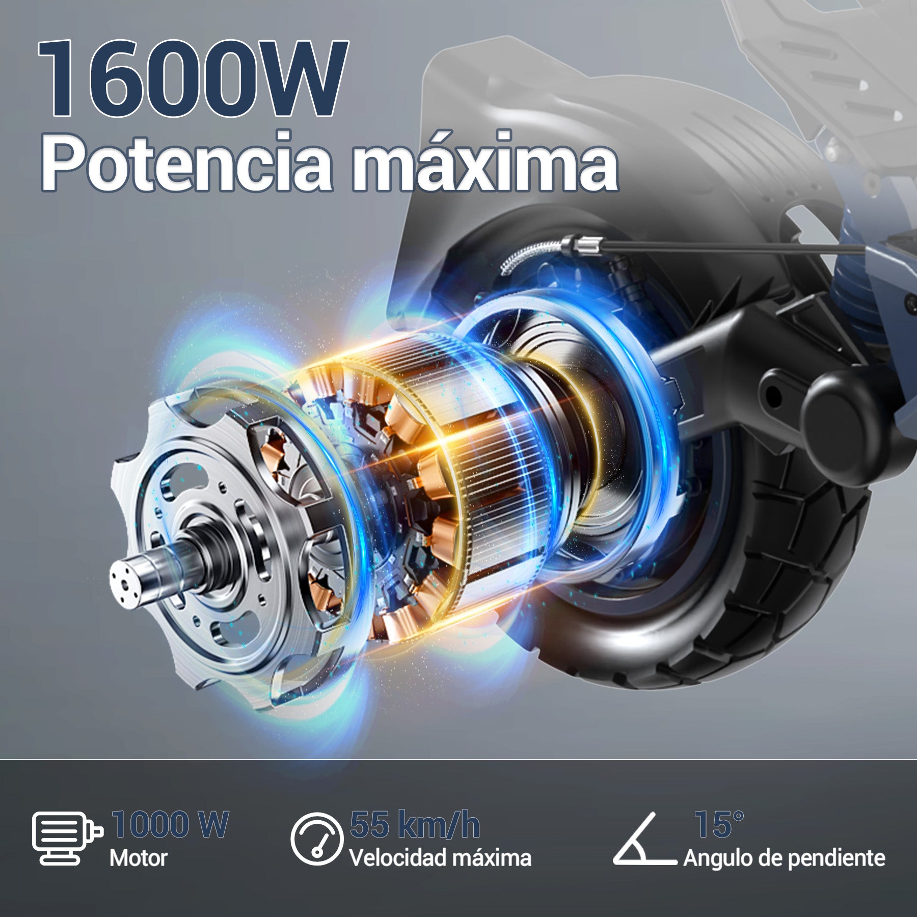 H16 scooter eléctrico está equipado con motor de 1000 W nominal, 1600 W de potencia máxima explosión instantánea, fácil de conquistar las laderas empinadas y terrenos complejos. 55 km / h de velocidad, sentir la adrenalina; 15 ° capacidad de escalada extrema, sin miedo de montaña, grava, barro y otros desafíos del terreno, la verdadera libertad al aire libre fuera de la carretera!