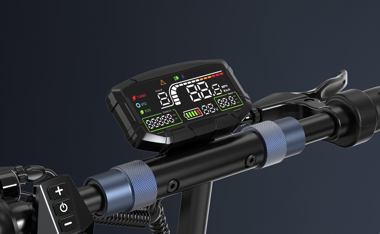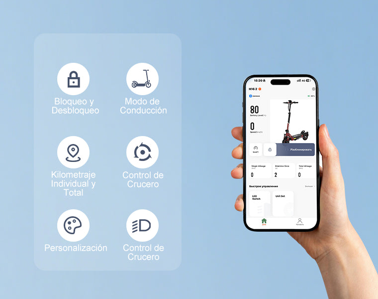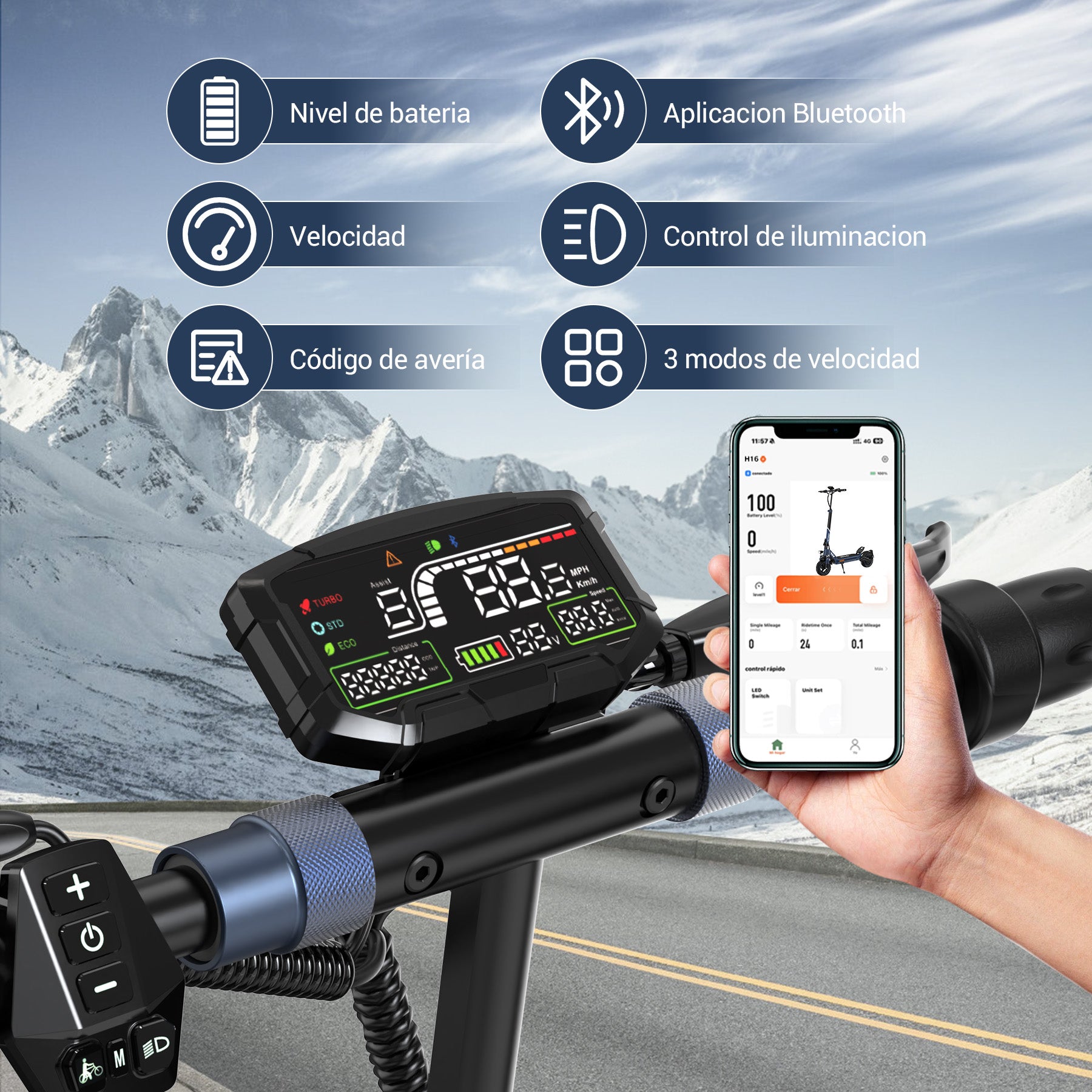 El scooter eléctrico H16 está equipado con pantalla inteligente LCD de alta definición, control en tiempo real de los datos de conducción, visualización precisa del porcentaje de batería restante, velocidad actual y registros de kilometraje total, rango en tiempo real, visualización de código de error. Soporta conexión inalámbrica Bluetooth, descarga la exclusiva APP HITWAY para conseguir: bloqueo/desbloqueo del teléfono móvil, modo de conducción personalizado/estadísticas de kilometraje.