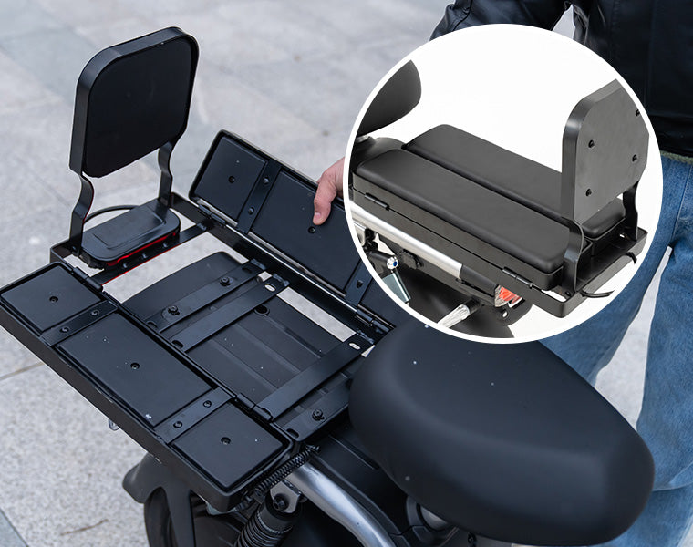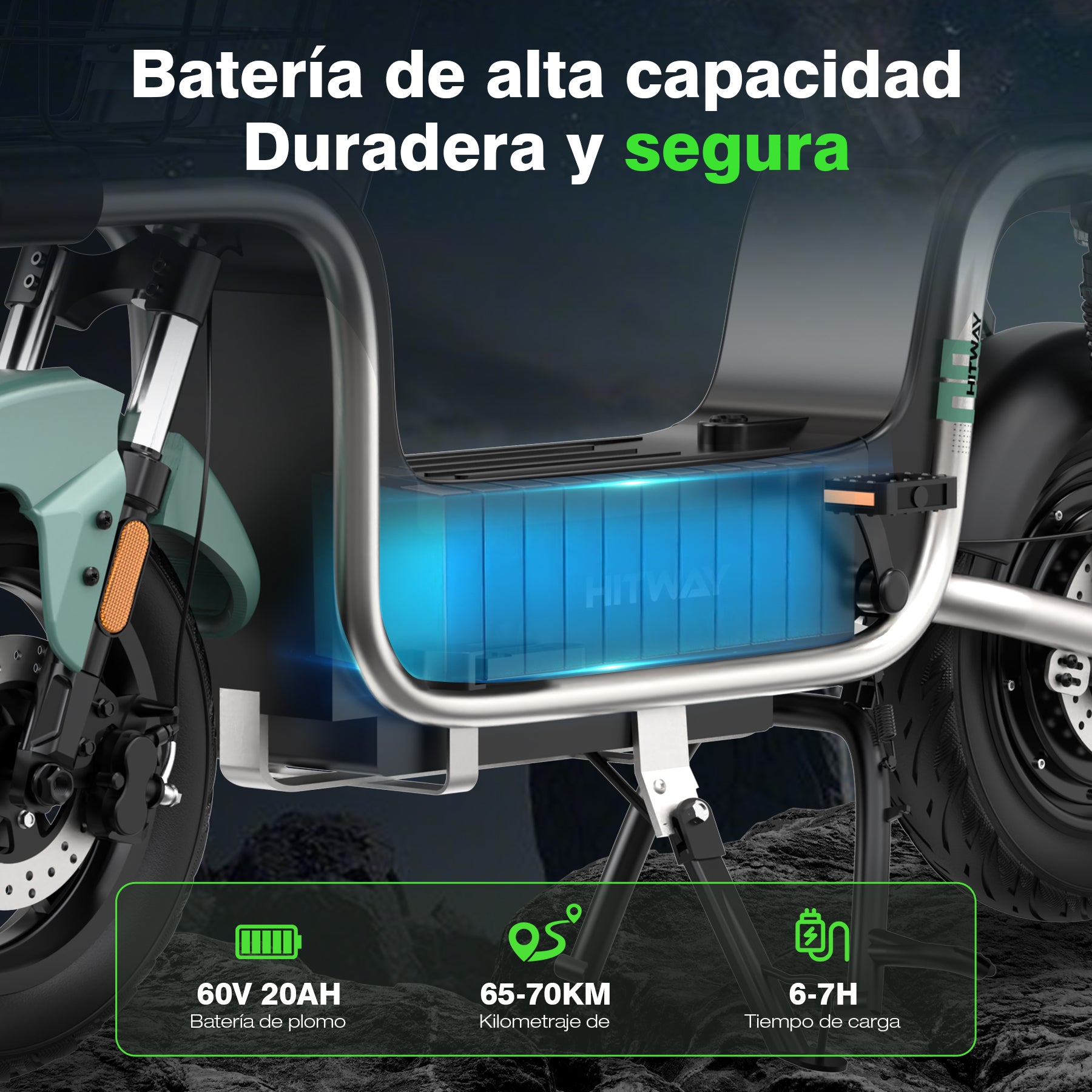 Súper potencia de 1000W, potencia máxima de hasta 1500W, fácil de superar pendientes empinadas de hasta 15°. Velocidad de 47KM/H duplica la eficiencia de los desplazamientos, ya no tiene que preocuparse por llegar tarde. La batería de 60V 20AH es de ultra larga duración, cargando una vez puede funcionar durante varios días, y se puede llenar en 6-7 horas. Asiento trasero multifuncional puede llevar tanto a las personas y las mercancías para satisfacer sus múltiples necesidades.